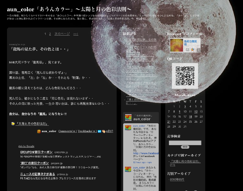 ブログ aun_color「あうんカラー」〜太陽と月の色彩法則〜 http://blog.livedoor.jp/aun_color/ ← こちらをクリックしてご覧下さい。 「色」のエッセイを綴っています。